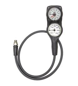 The 2-gauge console combines a submersible pressure (contents) gauge and a depth gauge housed in a specially designed case. The unit is completed with a high pressure hose.